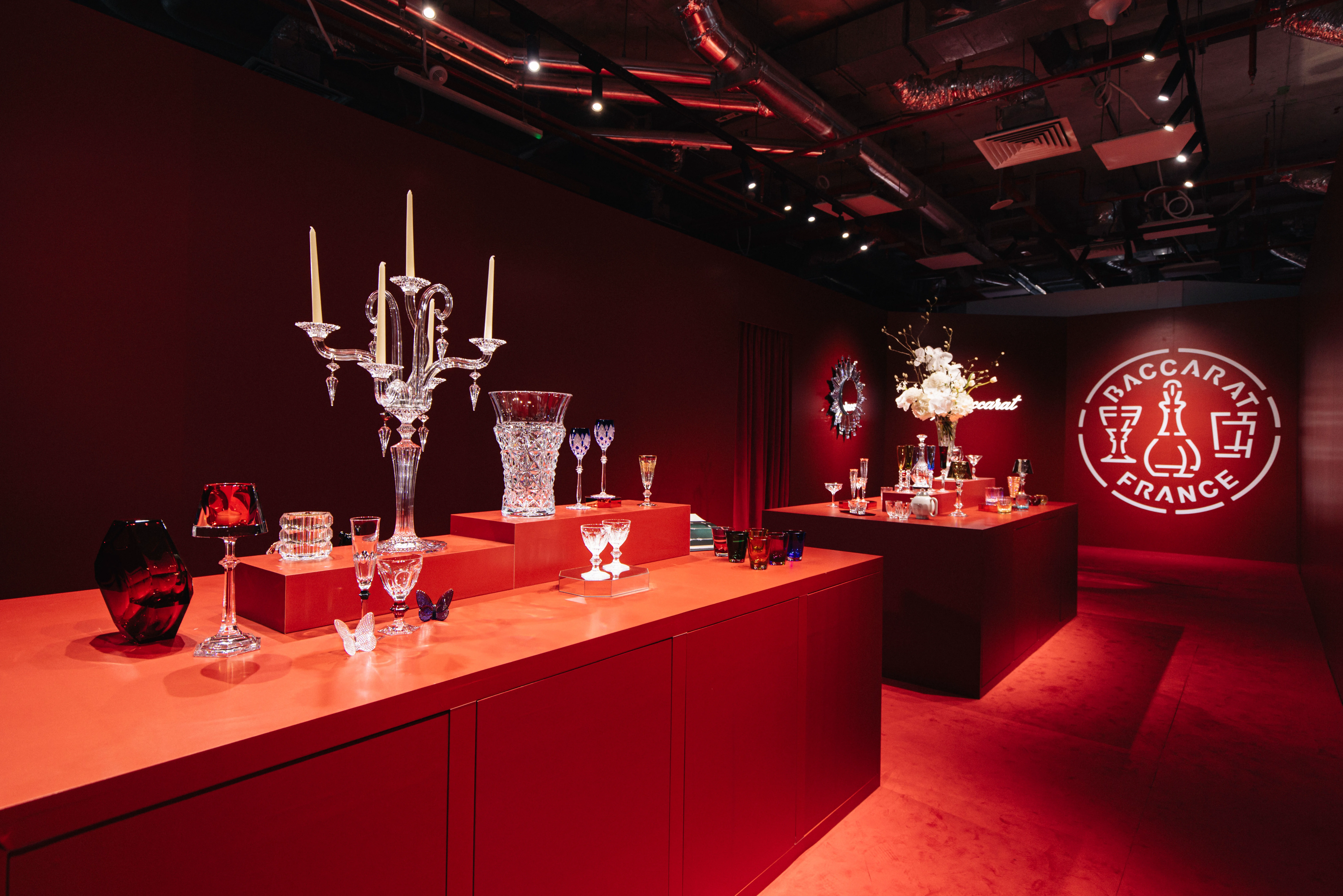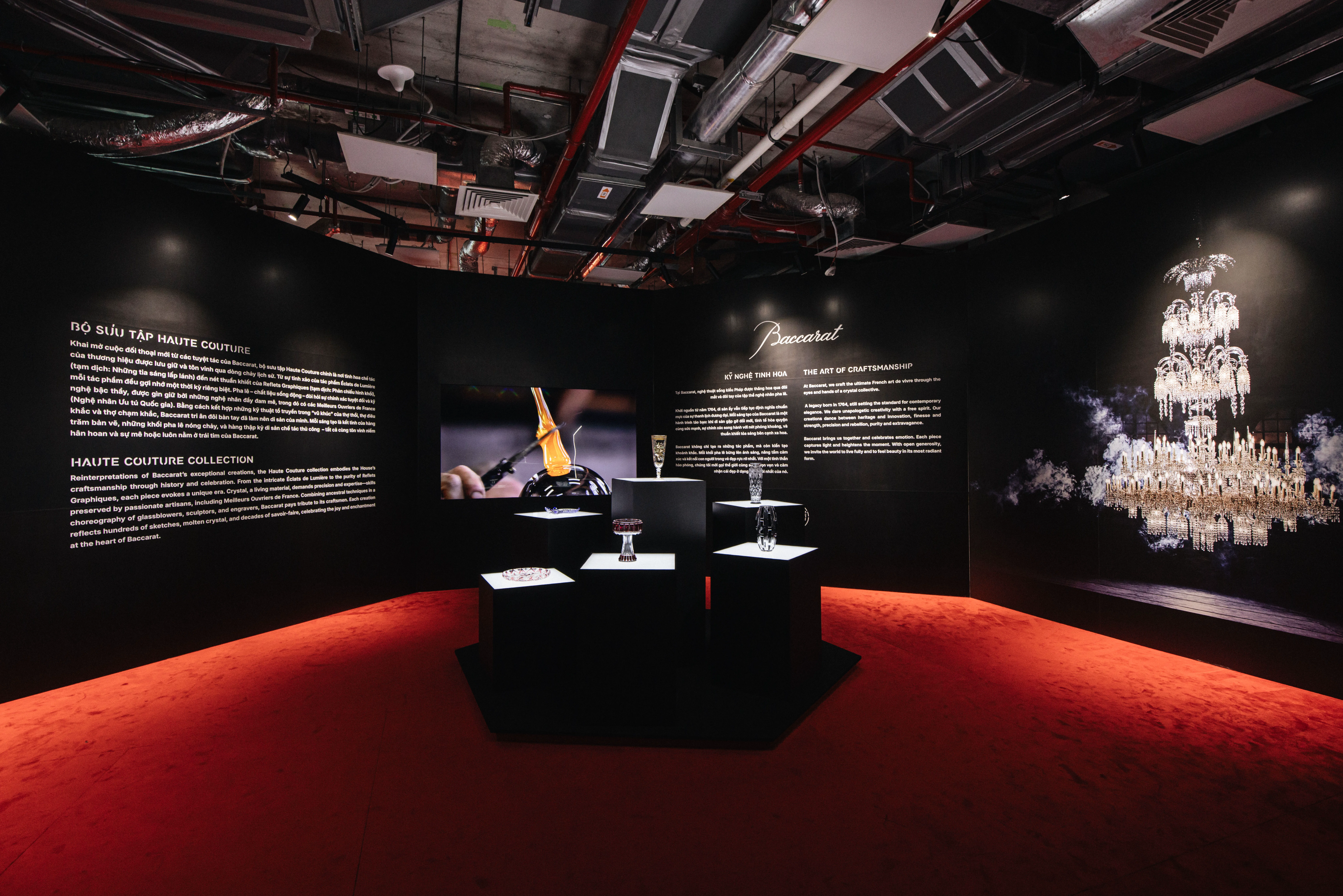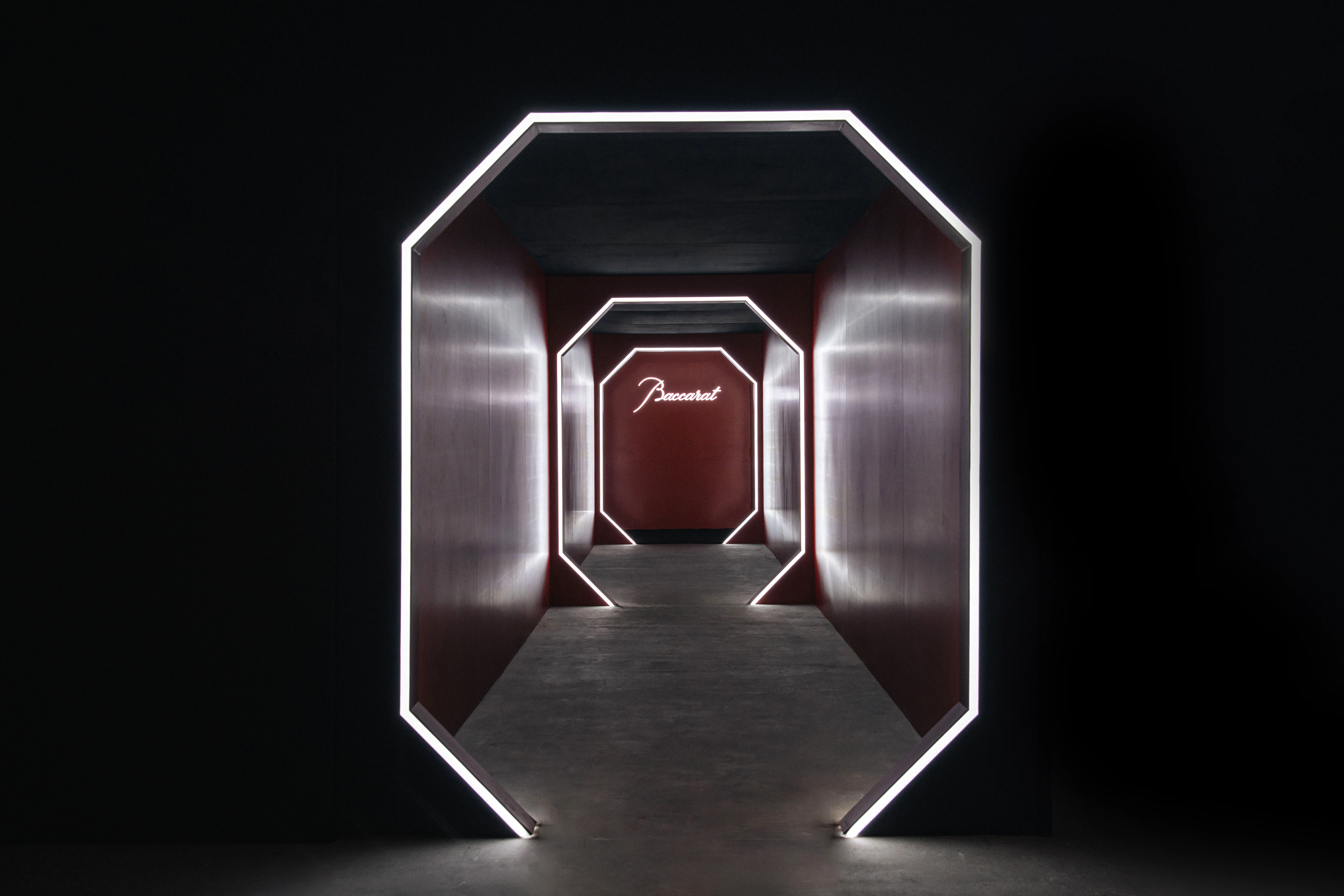Bước qua cổng vào được bao phủ bởi sắc đỏ sâu thẳm và đường viền ánh sáng trắng rực rỡ — người xem như bước vào một chiều không gian khác: nơi thời gian ngưng đọng, và từng tia sáng phản chiếu tinh tế tôn vinh di sản chế tác thủ công của Baccarat.