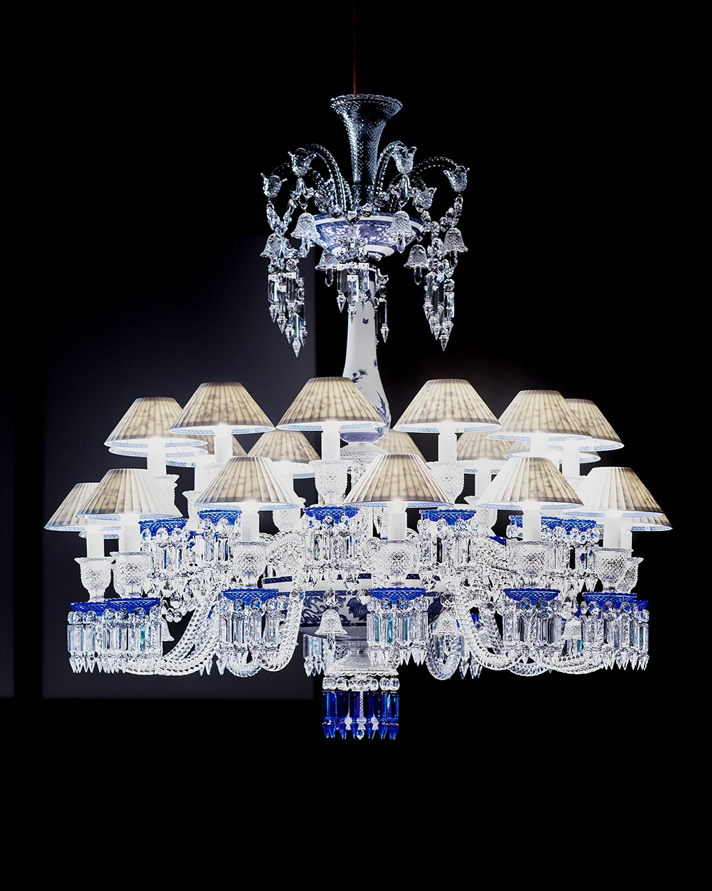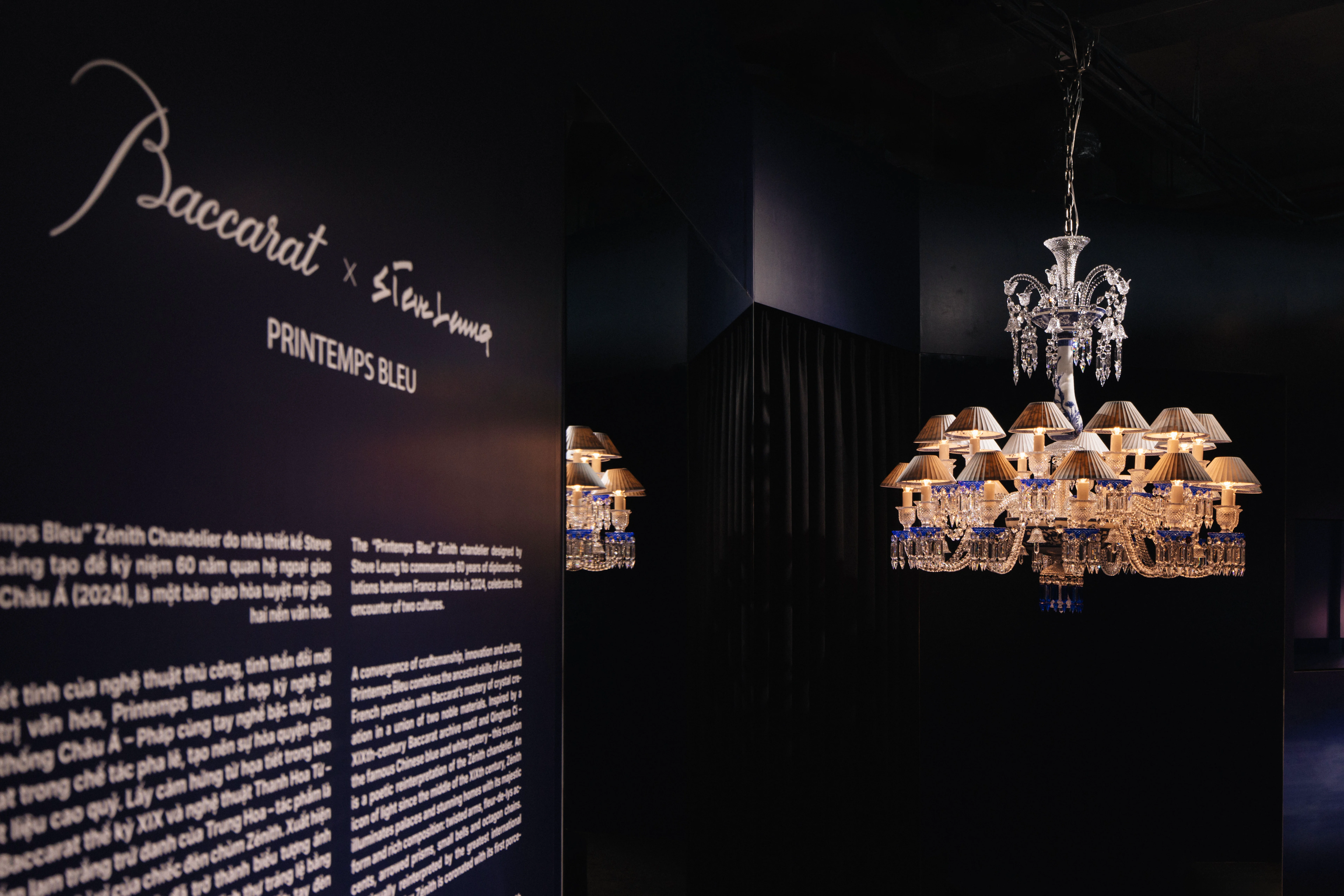 Khoảnh khắc chiêm ngưỡng Printemps Bleu chính là đoạn cao trào xúc cảm. Được sáng tạo bởi nhà thiết kế quốc tế Steve Leung cùng nghệ nhân Baccarat, Printemps Bleu là sự tái diễn giải táo bạo chiếc đèn chùm Zenith biểu tượng. Tác phẩm kết hợp pha lê trong suốt và xanh cobalt cùng chao đèn bằng sứ Limoges, nơi họa tiết Thanh Hoa (Qinghua Ci) được ẩn phía trong lớp sứ mỏng. Khi ánh sáng bừng lên, những cánh hoa xanh lam khẽ lay động, phản chiếu trong pha lê lấp lánh, tạo nên một vũ điệu ánh sáng vừa đương đại vừa trường tồn.