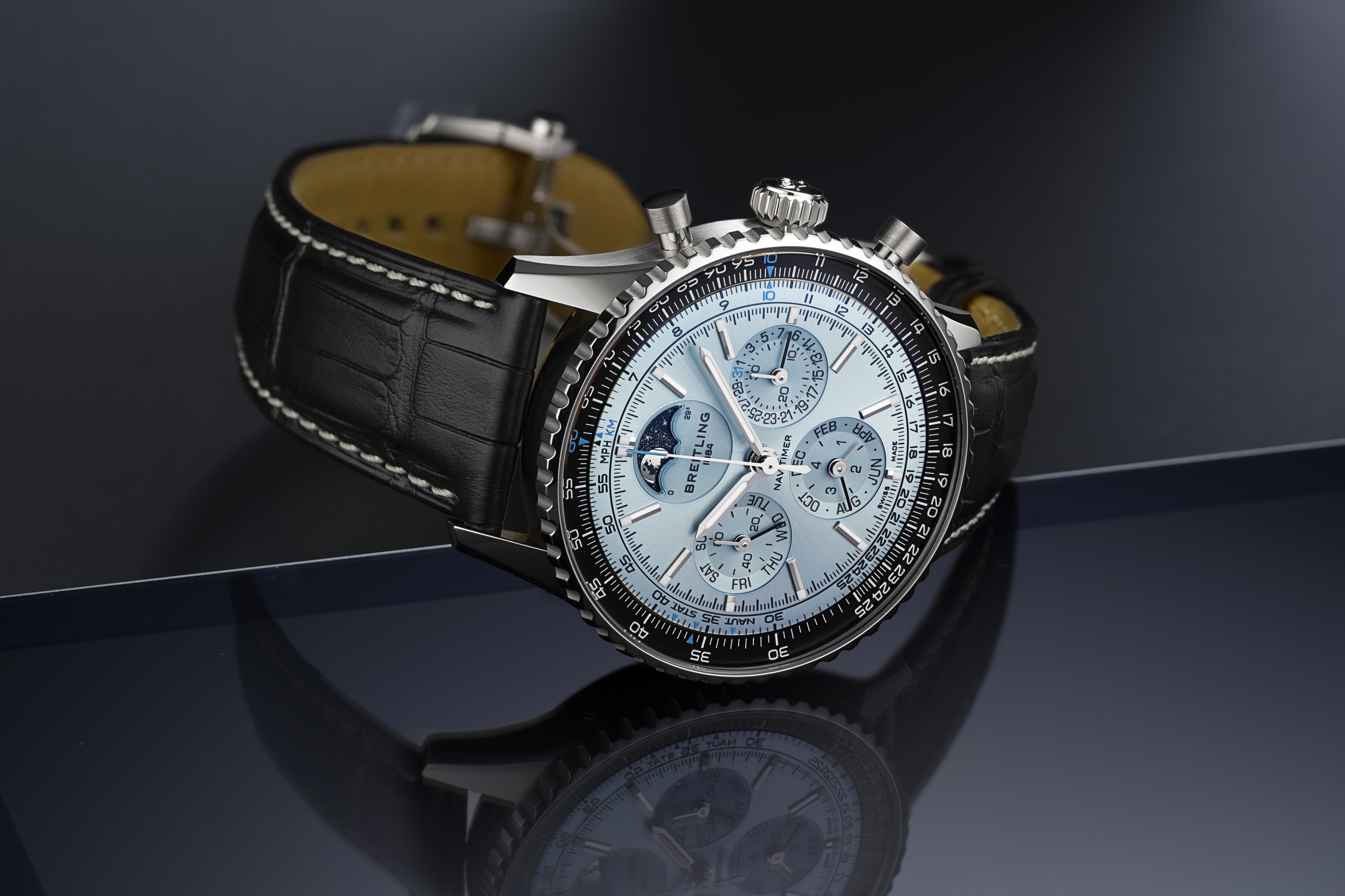 Giờ đây, Navitimer được trang bị bộ chuyển động chronograph lịch vạn niên độc quyền đầu tiên của Breitling - Caliber B19 ra mắt vào năm 2024 nhân dịp kỷ niệm 140 năm thành lập của thương hiệu. Phiên bản mới này sở hữu mặt số màu xanh băng thanh lịch, kết hợp tinh tế cùng viền bezel bạch kim bên trong bộ vỏ 43mm. Điểm nhấn chính trên mặt số là khu vực hiển thị lịch tuần trăng ở vị trí 12 giờ.