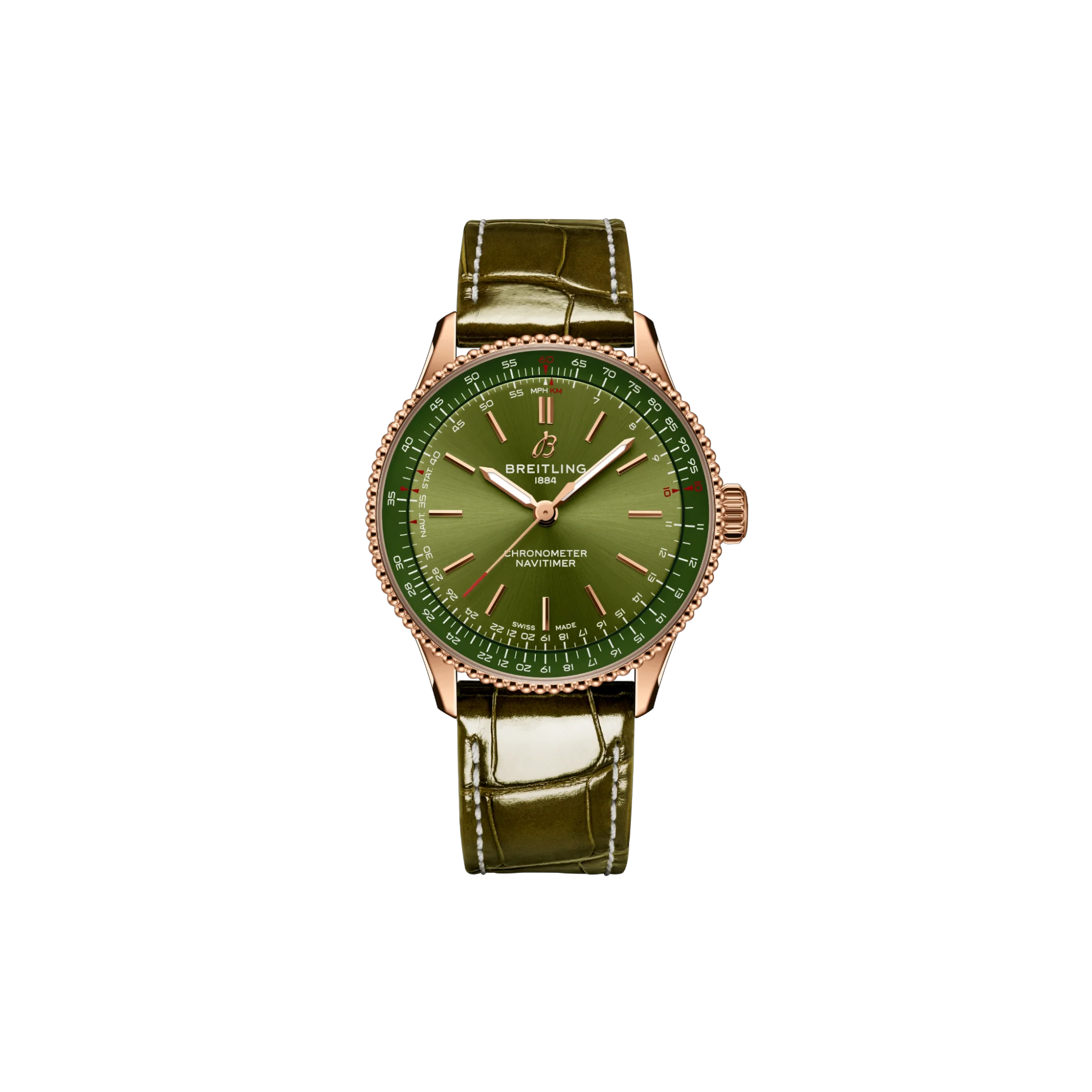 Navitimer Automatic 36 sở hữu mặt số xanh lá kết hợp cơ chế slide rule cùng tông màu, tạo nên tổng thể đơn sắc đầy tinh tế. Mẫu đồng hồ vận hành bởi bộ máy tự động Breitling Caliber 17 với chức năng hiển thị thời gian thuần túy. Đường kính 36mm mang đến tỷ lệ hài hoà cho những ai ưa chuộng kích thước nhỏ gọn đi kèm bố cục tối giản. Đồng hồ được trang bị dây da cá sấu màu xanh lá đồng điệu cùng mặt số, kết hợp khóa gập bằng vàng đỏ.