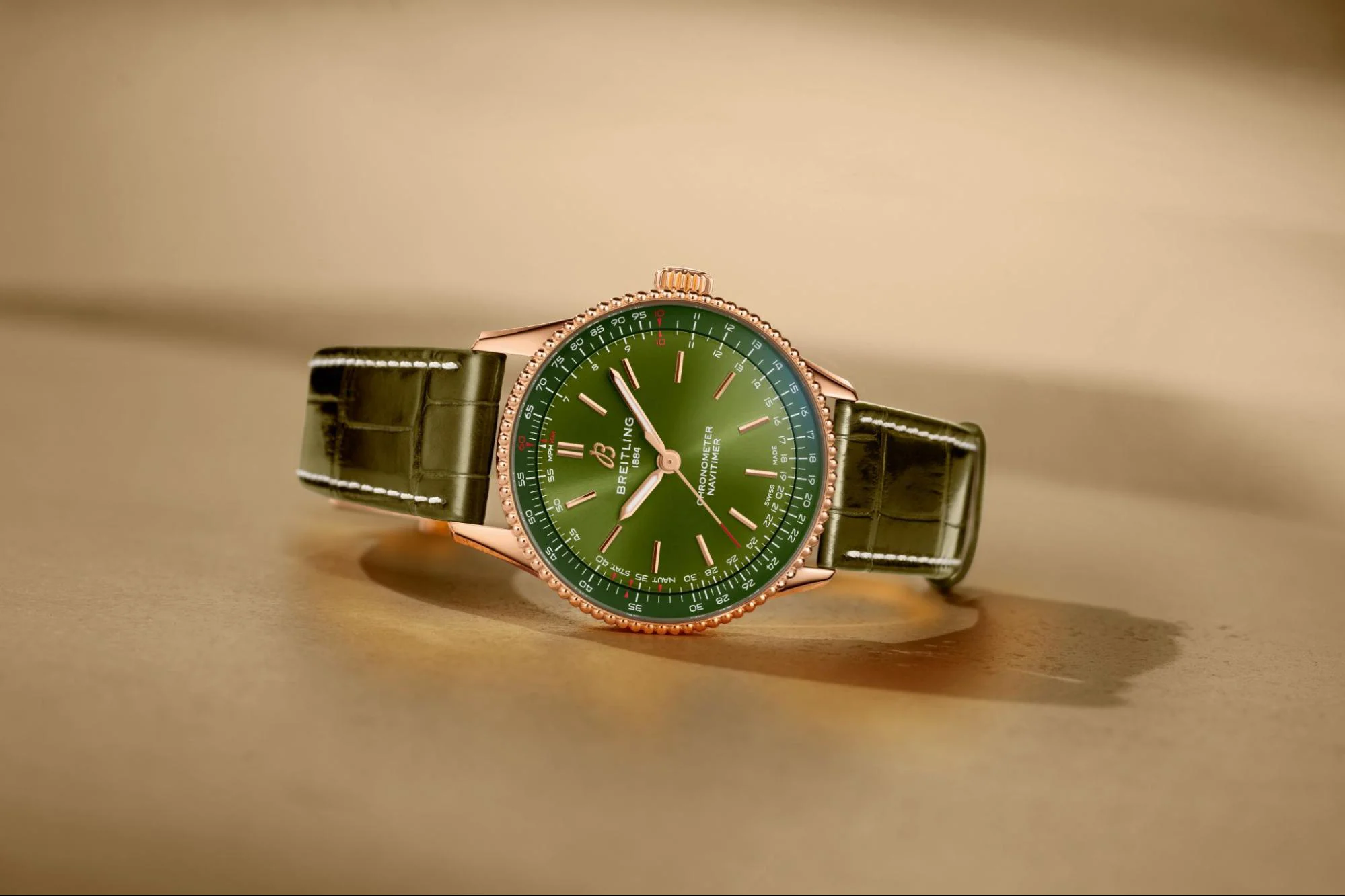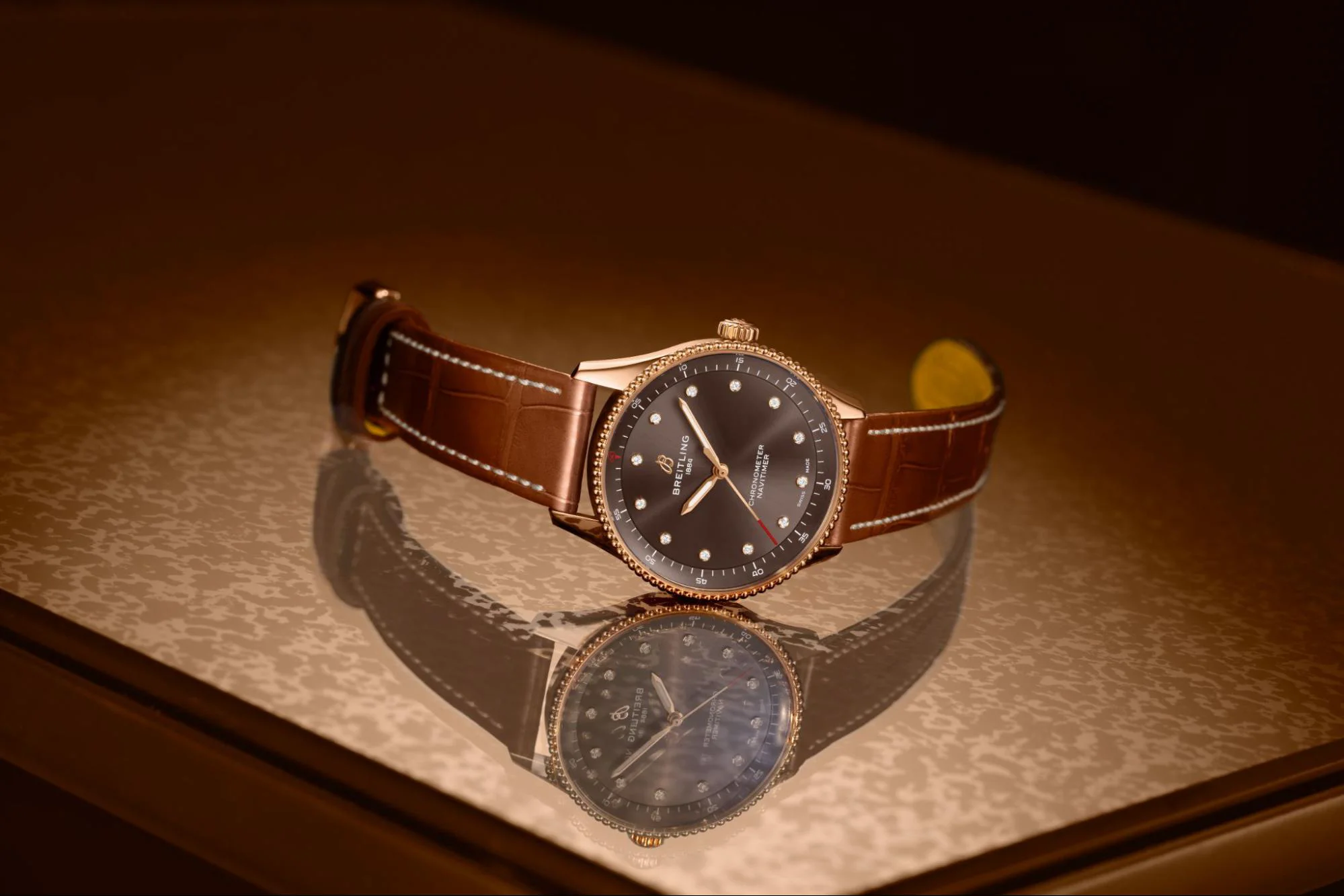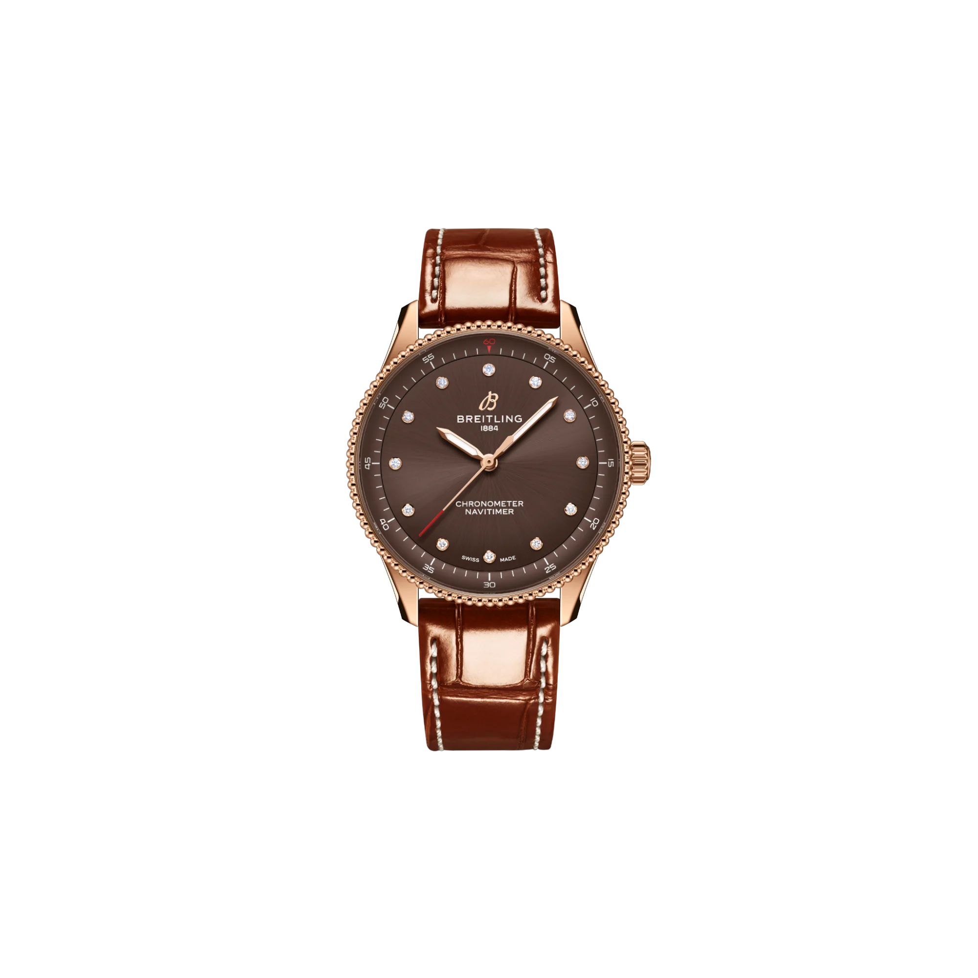Navitimer 32 được hoàn thiện với mặt số nâu và cơ chế slide rule cùng tông màu, điểm xuyết các cọc số bằng kim cương tinh tế. Đây là mẫu nhỏ nhất trong bộ sưu tập, sử dụng bộ máy SuperQuartz™ Caliber 77 có khả năng bù nhiệt, cho phép đạt được độ mỏng ấn tượng chỉ 8 mm. Dây da cá sấu màu nâu kết hợp khóa cài bằng vàng đỏ mang đến vẻ sang trọng và cân đối. Khác với viền bezel có rãnh đặc trưng của các mẫu chronograph Navitimer, hai mẫu hiển thị thời gian thuần tuý được trang bị vành bezel dạng hạt tròn, gợi nhớ những thiết kế Navitimer đầu tiên của thập niên 1950.