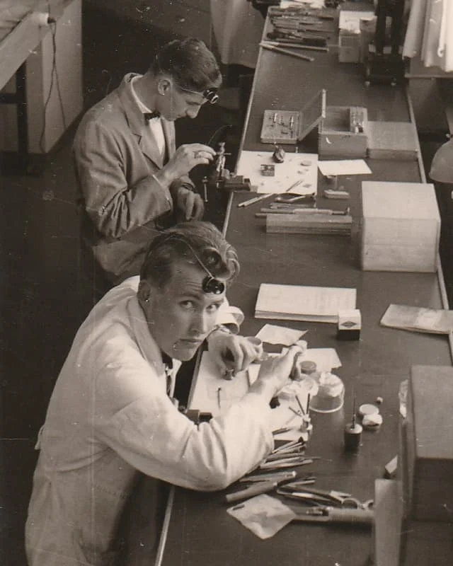 Kurt Klaus (phía trên) đang làm việc tại xưởng chế tác vào những năm 1950