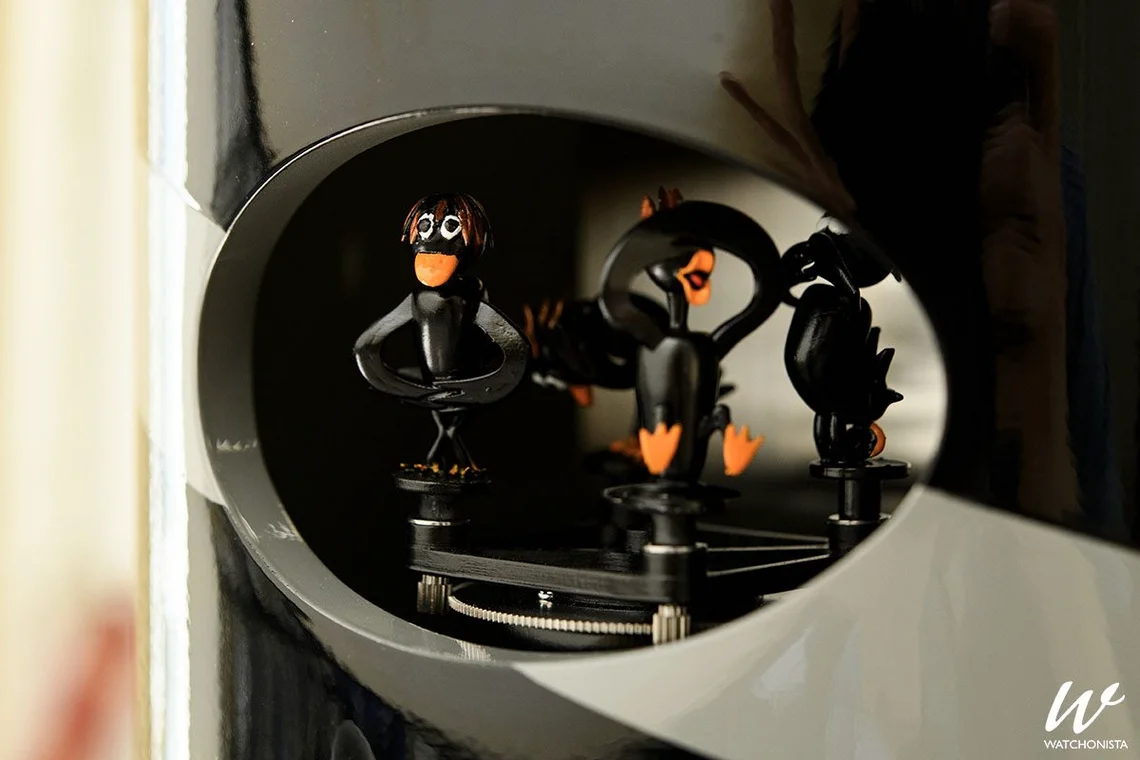 Tác phẩm điêu khắc động học này ẩn chứa bên trong một cơ chế Cuckoo tinh vi được phát triển hoàn toàn in-house, tích hợp ba chức năng chính: hộp nhạc cơ học, tính năng điểm chuông theo giờ, và tiếng chim Cuckoo đặc trưng. Cuckoo và tiếng chuông vang lên đồng thời – điểm đủ số chuông theo từng mốc giờ và một tiếng duy nhất vào mỗi nửa giờ. Sau khi kết thúc chuỗi điểm chuông, hộp nhạc bắt đầu chơi bản giai điệu riêng, đồng thời cơ cấu tự động thứ hai đưa các hình nhân chuyển động sống động như trong một vở kịch tí hon.