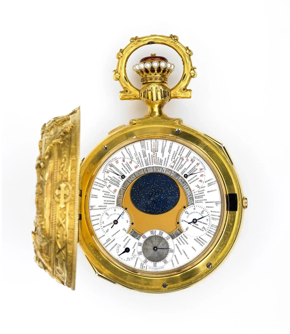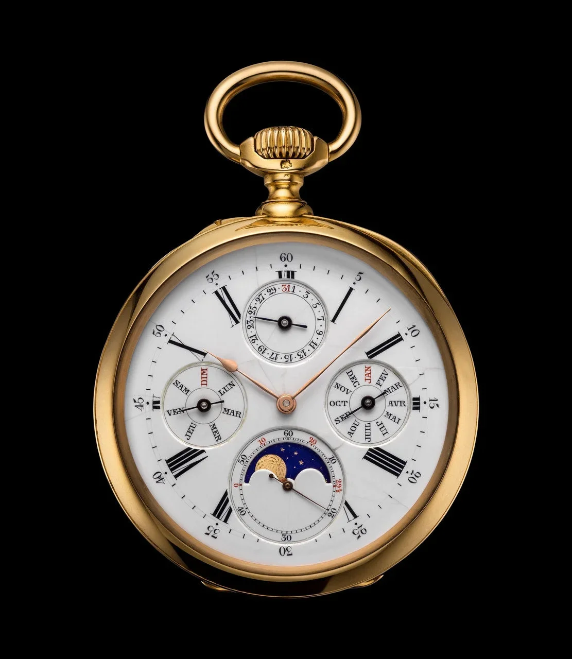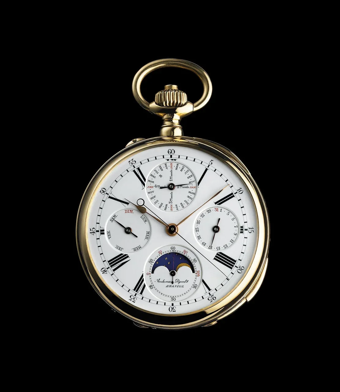 Chiếc đồng hồ được xem là kiệt tác tốt nghiệp của Jules Louis Audemars trong quá trình học nghề, tích hợp chức năng điểm chuông theo quý, lịch vạn niên và kim giây nhảy.