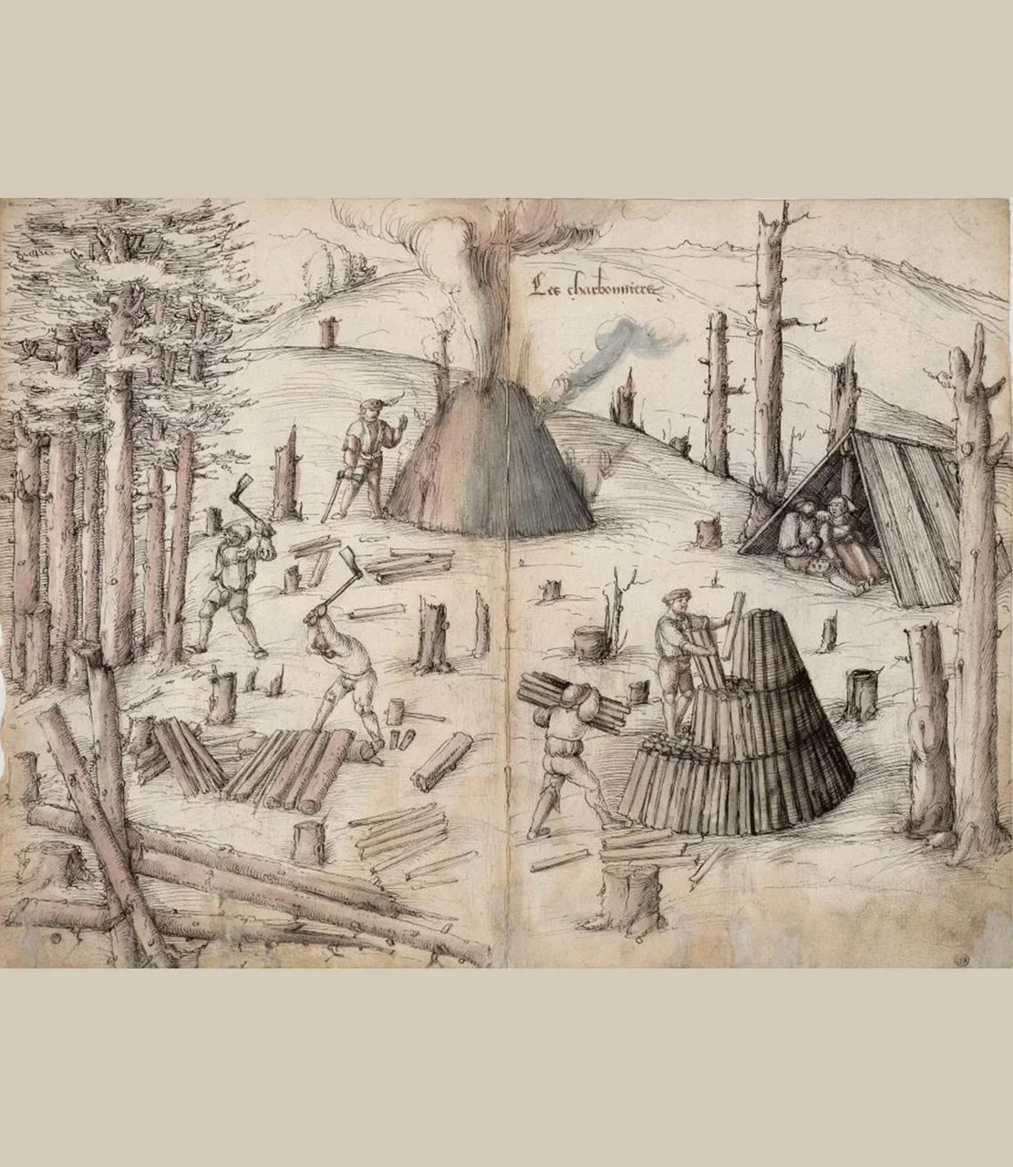 Tranh khắc mô tả hoạt động khai thác than nhằm luyện sắt cho các lò cao.