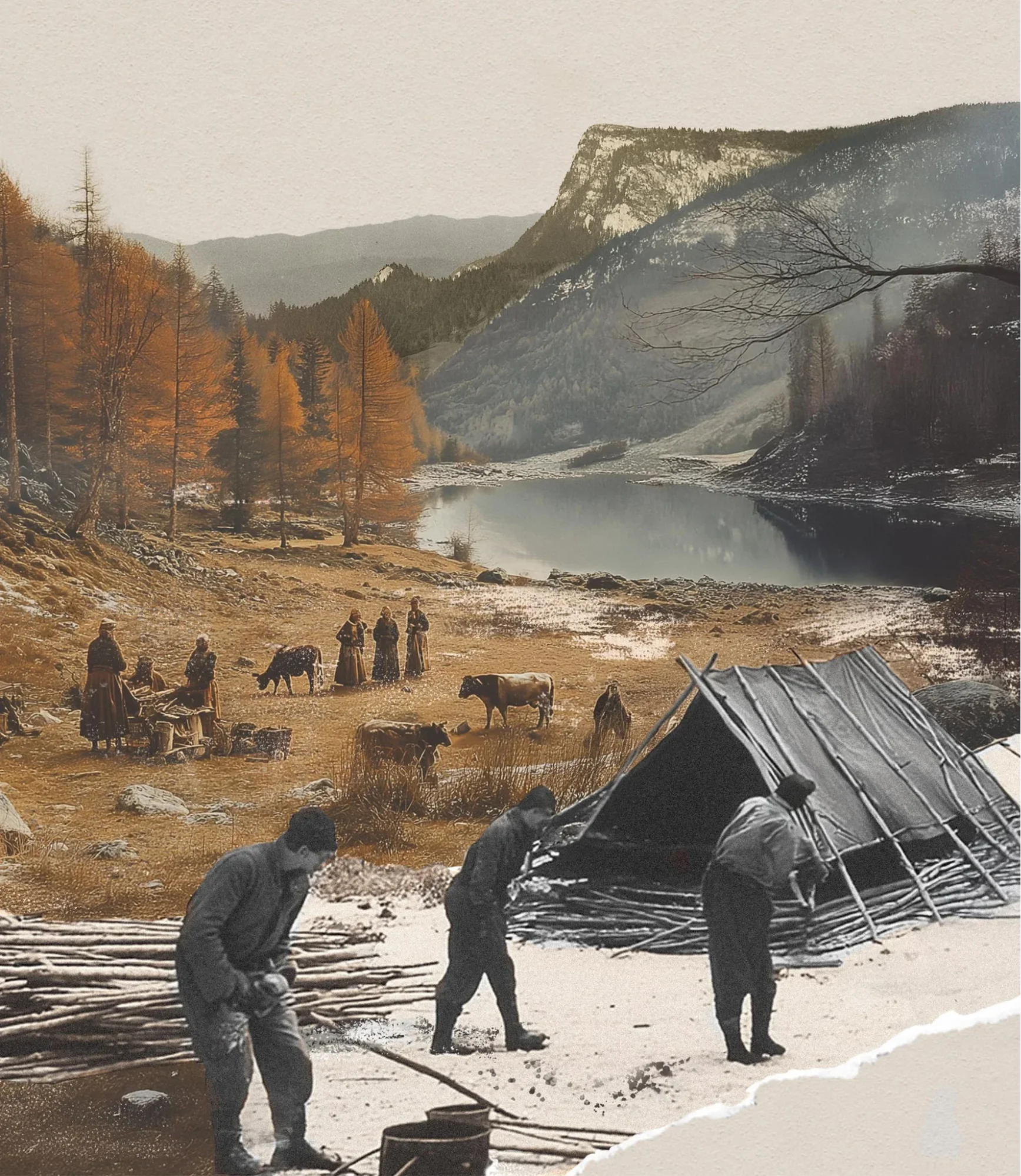 Hình ảnh tái hiện gia tộc Piguet cùng với một số nhà khai hoang đến định cư tại vùng Vallée de Joux vào thế kỷ XIII