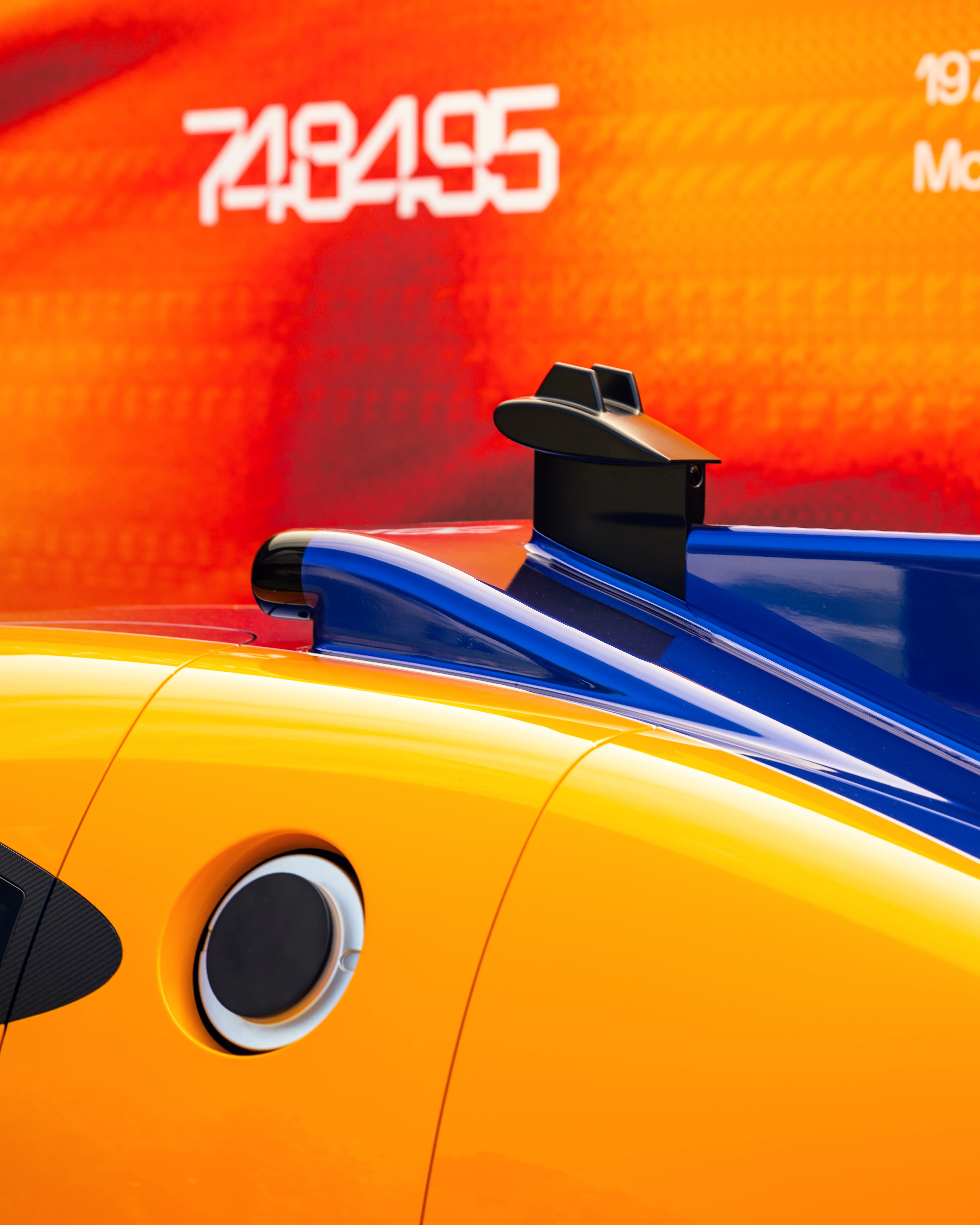 Thoạt nhìn, diện mạo mới của chiếc hypercar mang đậm dấu ấn lịch sử, tái hiện chiến thắng đầu tiên trong hành trình Triple Crown của McLaren. Xe khoác lên sắc cam đặc trưng của McLaren, điểm xuyết bởi dải xanh đậm ở trung tâm lấy cảm hứng từ lá cờ bang Texas. Trên nắp buồng lái nổi bật ngôi sao trắng, biểu tượng từ chiếc mũ bảo hiểm của huyền thoại Johnny Rutherford, người được mệnh danh “Lone Star JR.”. Hoàn thiện thiết kế là số đua “3” quen thuộc của Rutherford cùng hai biểu tượng bất hủ của McLaren: Speedy Kiwi và Speedmark.