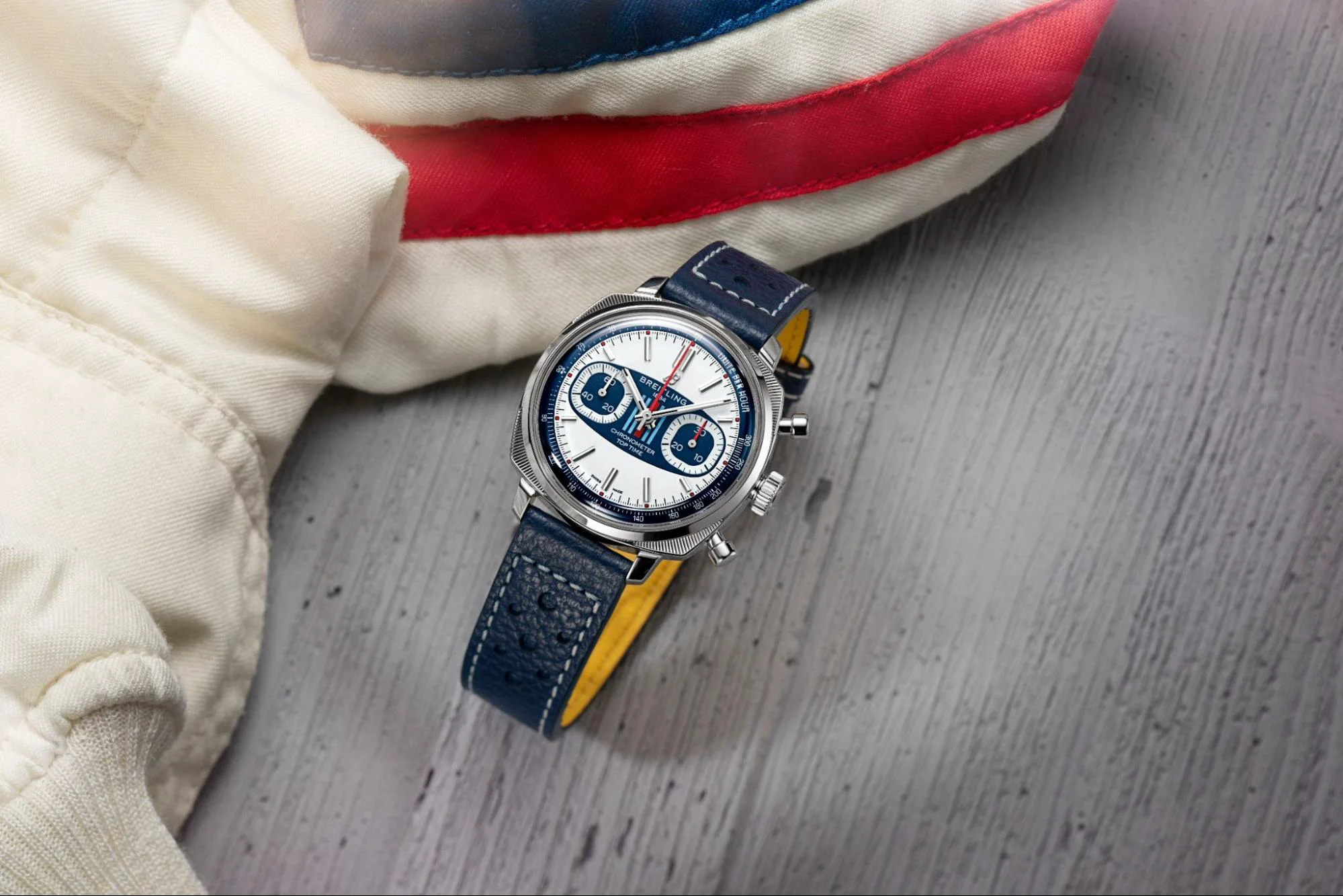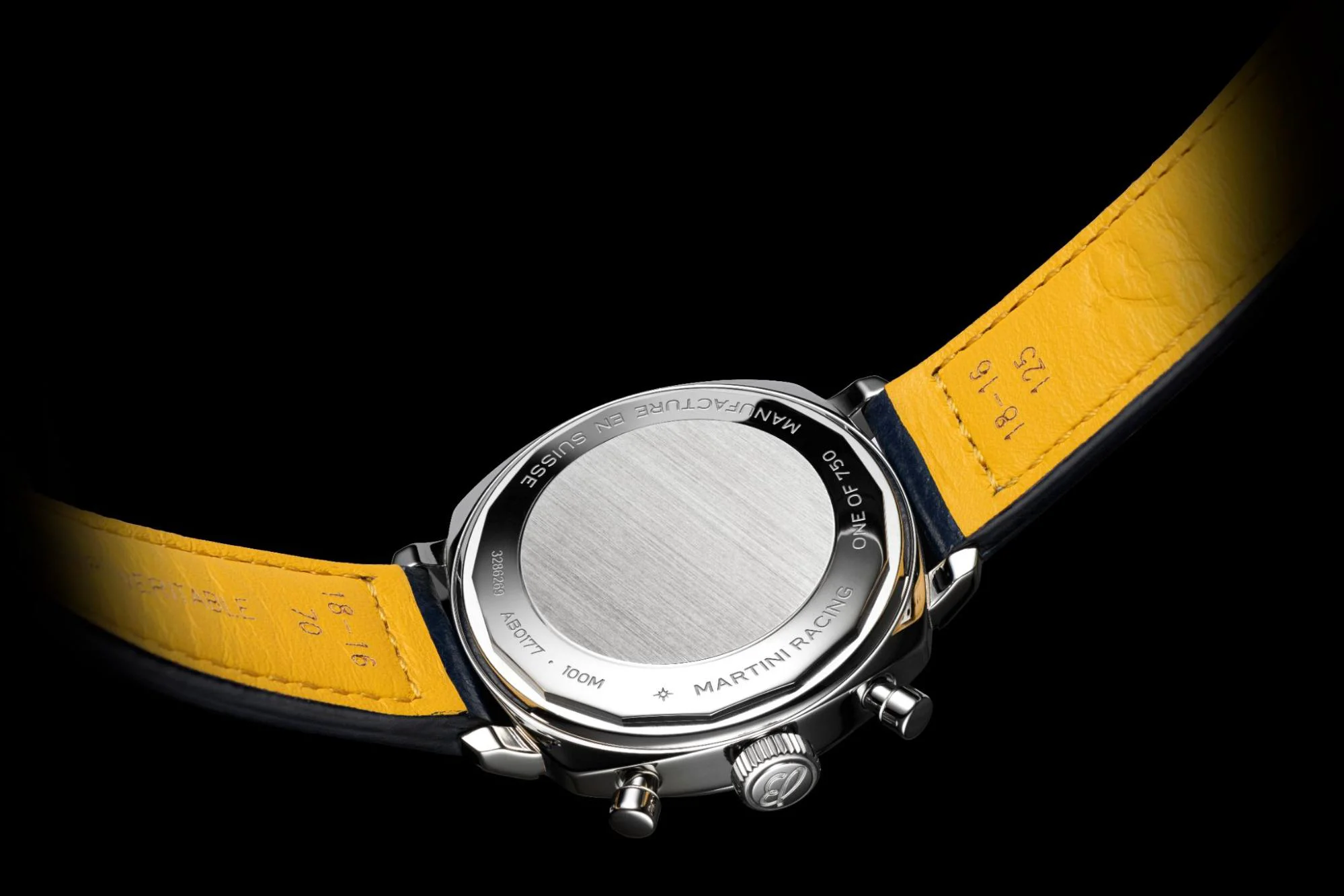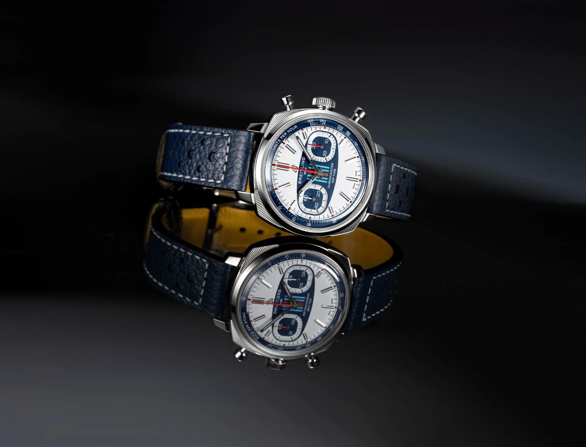Lần đầu tiên, Breitling và Martini Racing bắt tay hợp tác dựa trên niềm đam mê tốc độ, sự chính xác và hiệu suất tuyệt vời, tất cả tạo nên phiên bản Top Time Martini Racing giới hạn chỉ 750 chiếc, được khắc dòng chữ “One of 750” và “Martini Racing” ở mặt sau của đồng hồ.