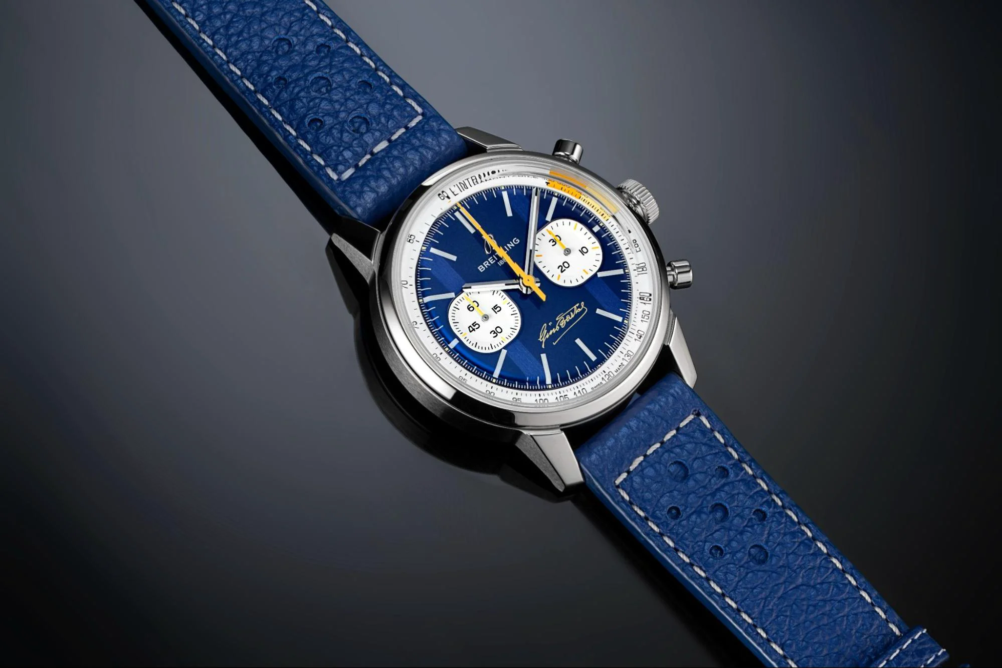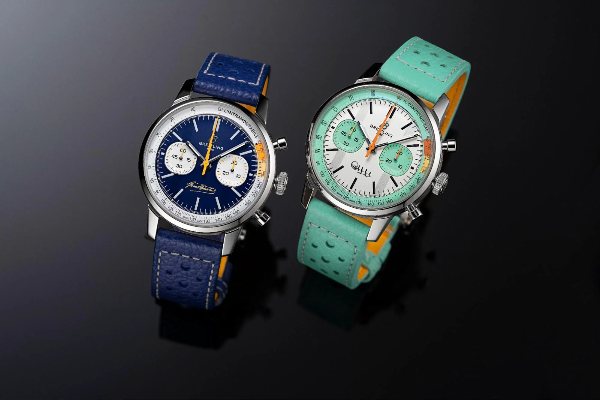Top Time B01 Fausto Coppi sở hữu mặt số trắng với các mặt số phụ màu ngọc lam cùng kim giây hình tia sét màu cam – sắc màu đặc trưng của chiếc xe đạp Coppi từng sử dụng. Trong khi đó, Top Time B01 Gino Bartali mang sắc xanh dương chủ đạo, được tô điểm bởi các điểm nhấn màu vàng – gợi nhớ đến chiếc áo thi đấu đã gắn liền với hình tượng của ông.